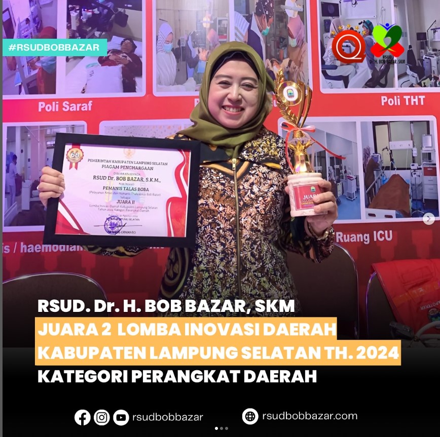 RSUD Dr. H. Bob Bazar, SKM Juara 2 Inovasi Daerah Kabupaten Lampung Selatan (LINDA LAMSEL) Tahun 2024, untuk Kategori Perangkat Daerah. Dengan Inovasi PEMANIS TALAS BOBA (Pelayanan Aman dan Humanis Thalasemia Bob Bazar) yang diselenggarakan oleh Badan Riset dan Inovasi Daerah Kabupaten Lampung Selatan.